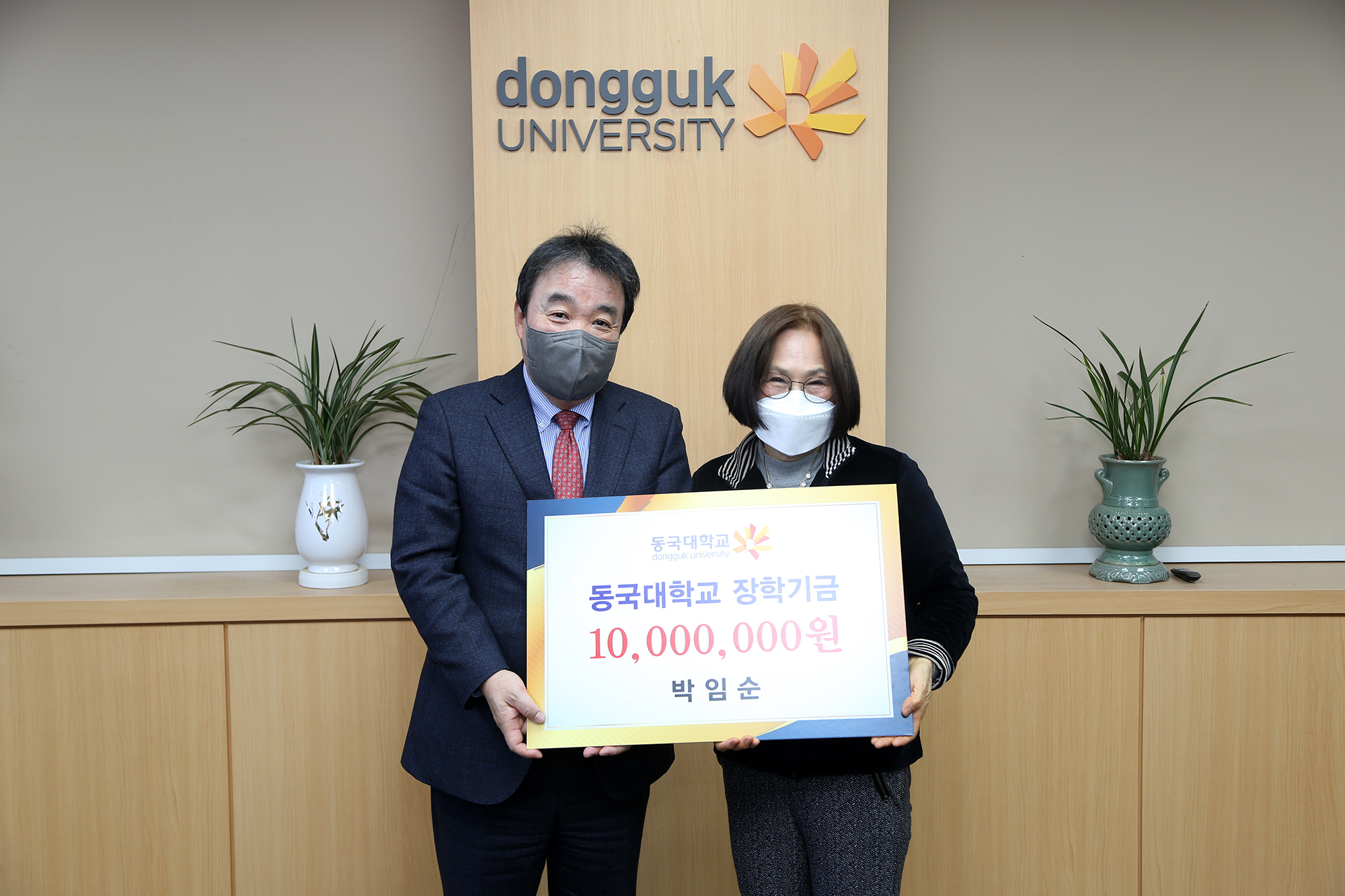 사연의 주인공 박임순 동문은 지난 18일(화) 모교인 동국대(총장 윤성이)를 찾아 기부금 1천만 원을 전달했다. 기부금은 그녀의 뜻에 따라 장애학생들을 위한 장학금으로 쓰일 예정이다.